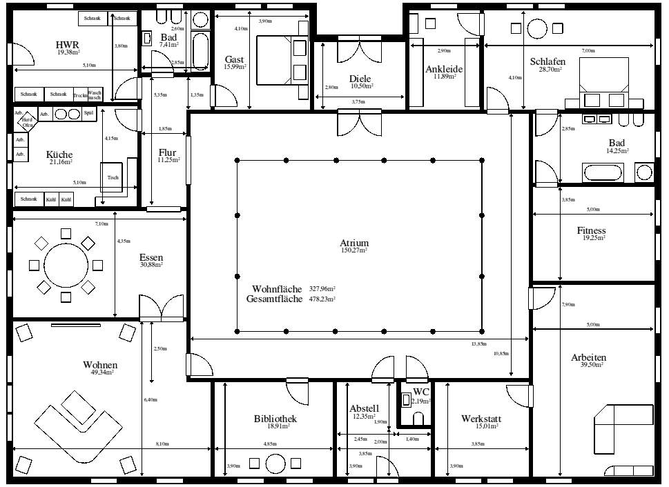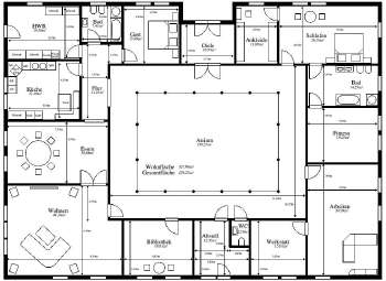 Entwurf 3, ebenerdig, geradlinig, mit Atrium |